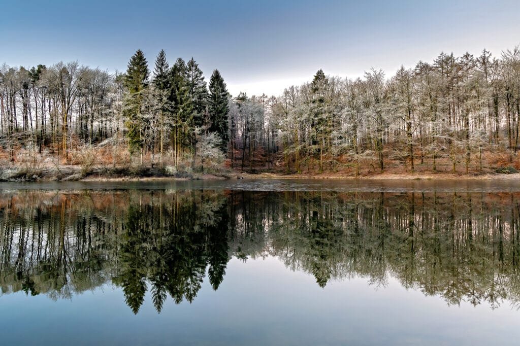 Spiegelung perfekt,Wildnis unberührt:加拿大路易斯湖畔的摩根? 福尔施! Das ist die stille, 霜冻 Schönheit der Neyetalsperre im Bergischen Land, 60 Minuten Fahrzeit von mir entfernt.