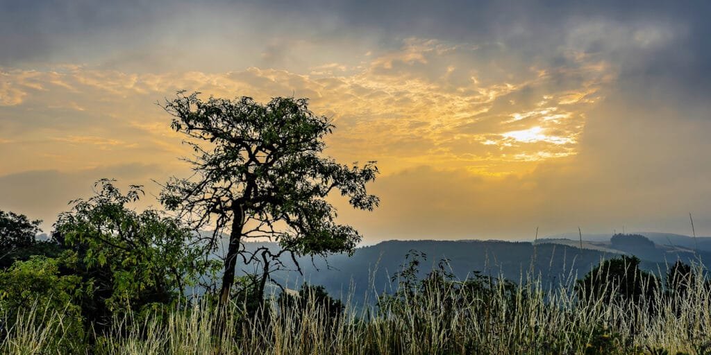 Einsamer Baum vor Dramatischem Sonneaufgang:Eine Szene aus der afrikanischen Savanne? 不。 Dieser Solitärbaum steht Nahe dem Ort Schuld im Ahrtal。.